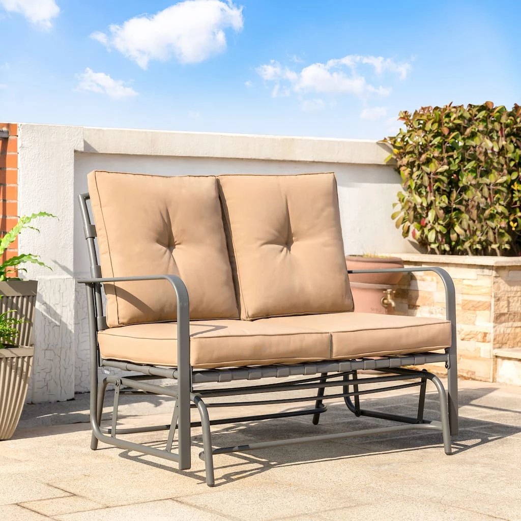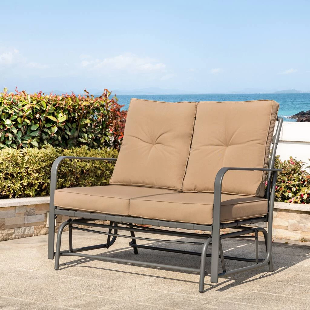 Turn your patio into a relaxing and comfortable place with this loveseat. This deep-seated loveseat, with its classic look, allows you and your family to kick back and enjoy the great outdoors. The water-resistant and UV-resistant fabric, high resilience sponge seat cushion and PP cotton back cushion with zipper making it removable and washable provide lasting soft and convenient service. Featuring ergonomically smooth armrest and swing rocking glider with gentle backward and forward motion, this chair set would relax yourself anytime and anywhere. The sturdy steel frame ensures you a quiet and smooth gliding experience. It’s a beautiful addition whether in your garden, patio, or courtyard!