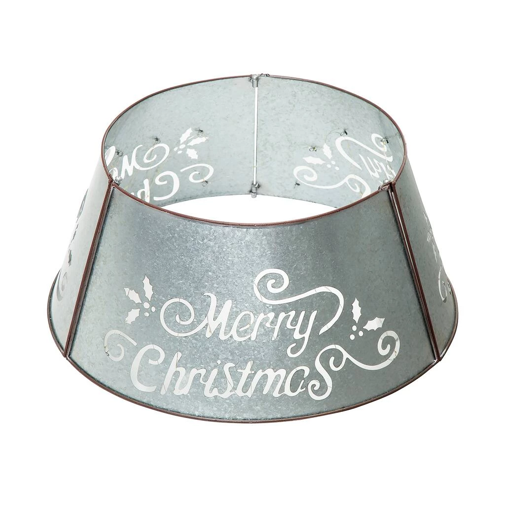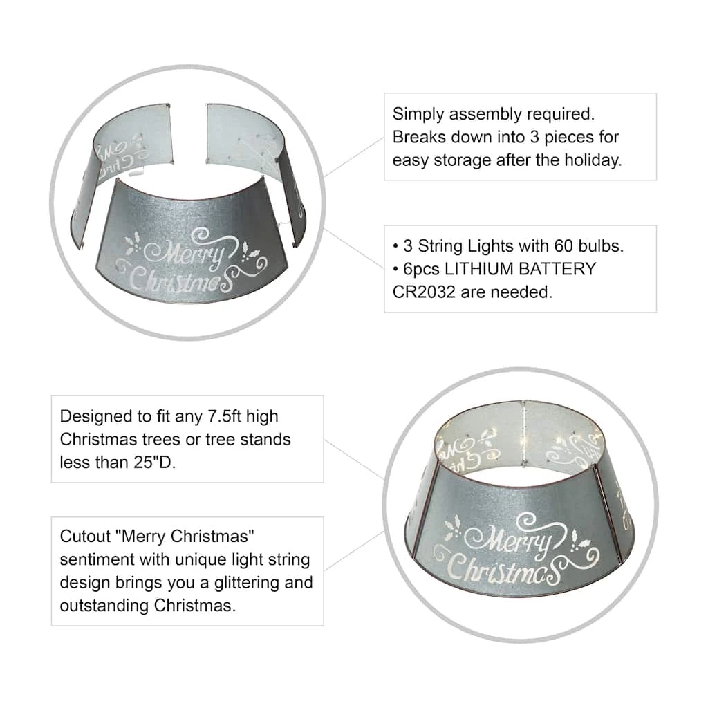 Add the final touch to your country Christmas with this galvanized metal tree collar with lights. It slightly flares out toward the base, which creates simple framing and covers the trees stand. Made from sturdy iron, you can use this collar for seasons to come. The unique cutout design with light strings will bring you a glittering and outstanding Christmas. Breaks down into 3 pieces for easy storage after the holiday.