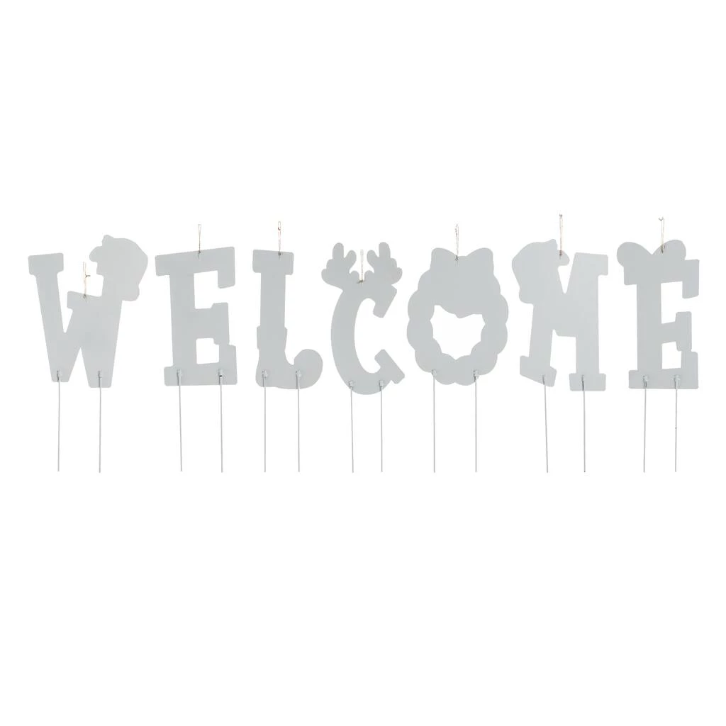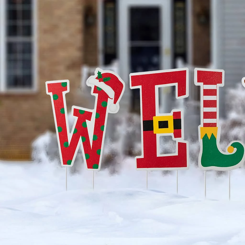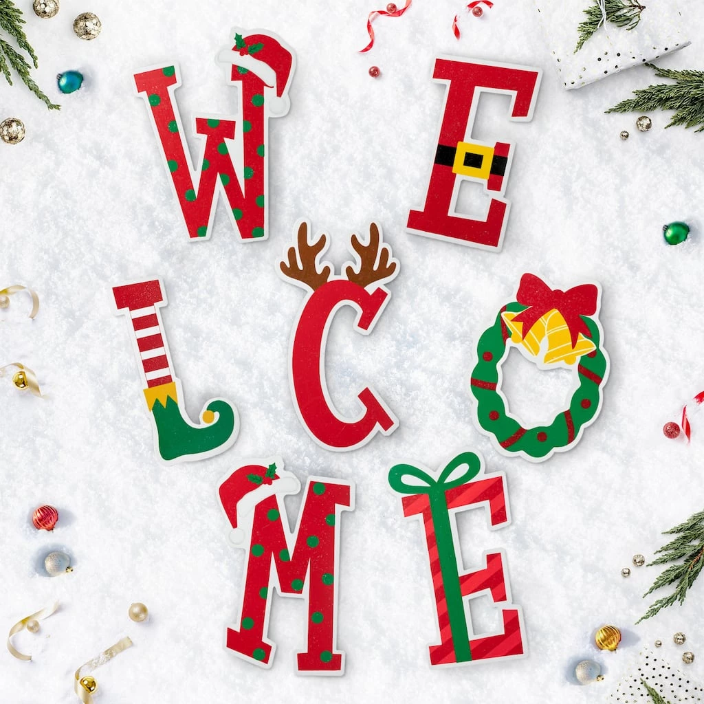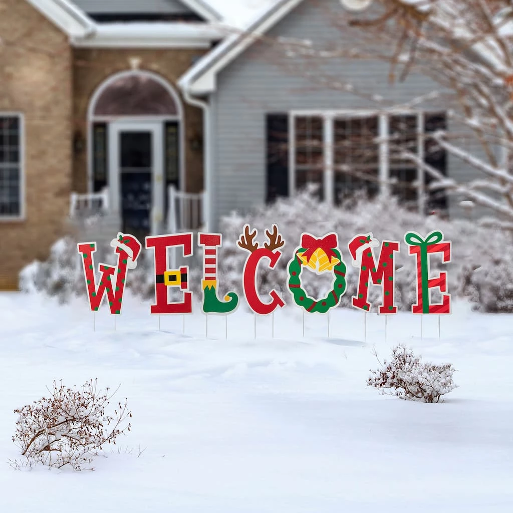 This set of of WELCOME yardstakes is sure to greet your friends and relatives with holiday cheer. Each letter features Christmas icons and colors with stylishly designed and valuable textured. Multifunctional, this set can also be used as a yardstake or hanging wall dΓ©cor to add cheer to your lawn, garden, door, or wall.