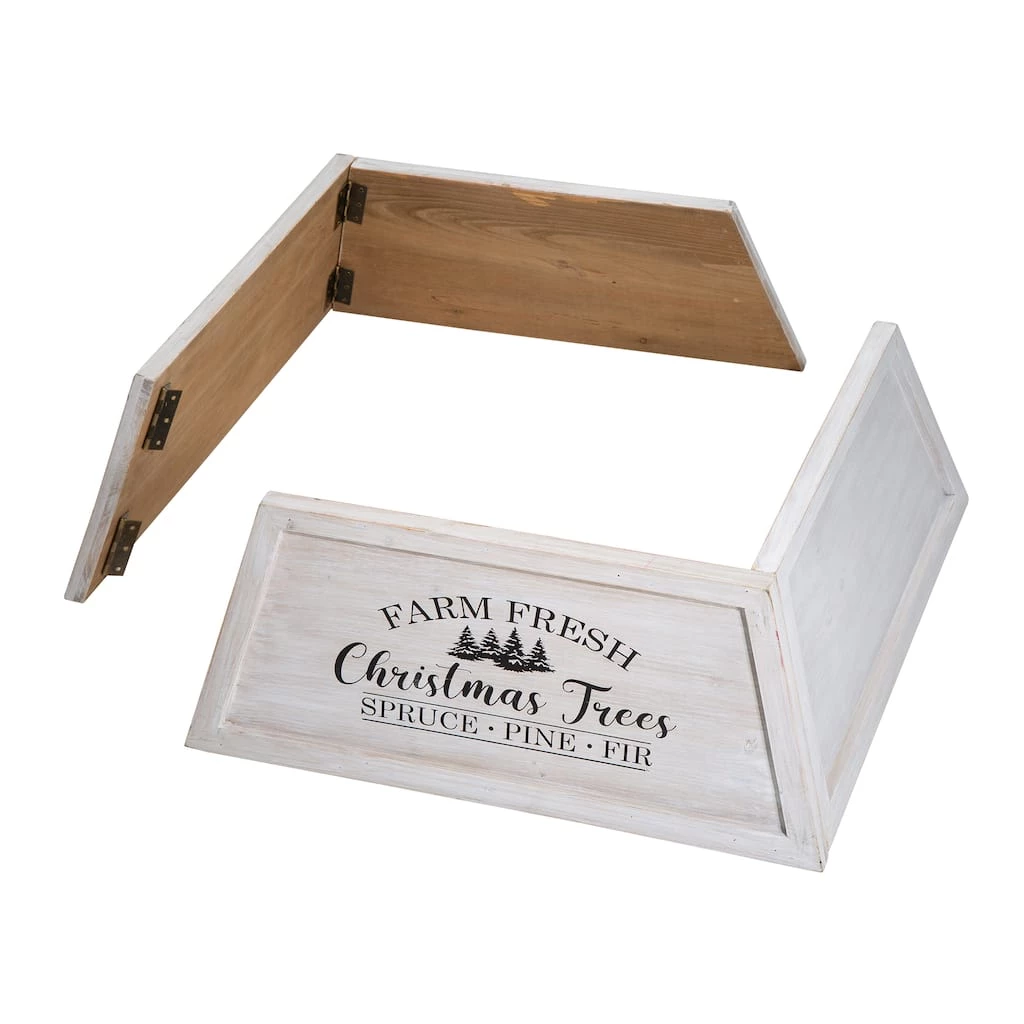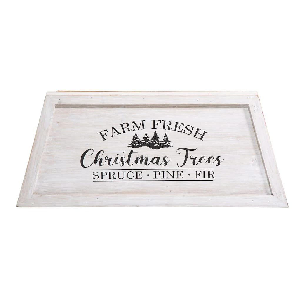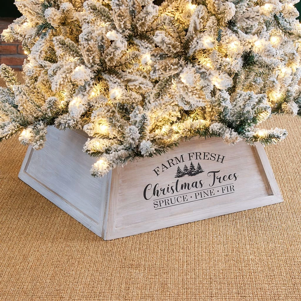 Our handcrafted tree box collars add a rustic, elegant charm to any home or business. The tree boxes not only add beauty and hide the undesirable parts of your tree, but they also prevent kids and pets from getting into the bottom side of your tree. They are made of solid wood. You will simply take the 2 side panels and lock them into the front panel. From, there you can then slide your box into place in front of your tree. The trapezoidal design adds a uniqueness to your tree. Handcrafted from sturdy and durable wood, with a unique trapezoid design accented with a farm fresh sentiment, this collar will bring you a vibrant farmhouse Christmas vibe. Breaks down into 2 pieces for easy storage after the holiday.