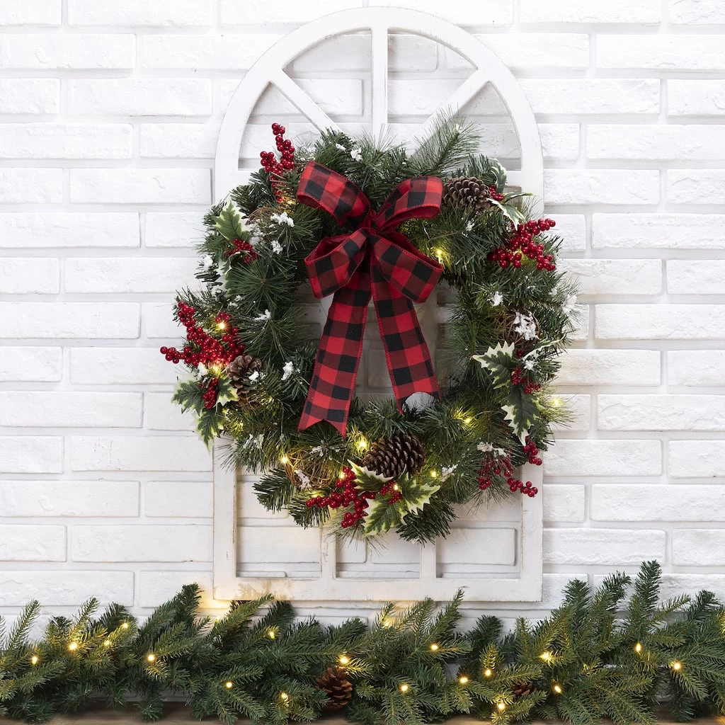 Adorn your home with lots of holiday style! This window with a wreath features a grapevine base adorned with glittered greenery including a mix of different types of tree needles and pinecones that give your holiday a woodland feel and touch. It’s perfect for decorating your front door or for use as an entryway feature to greet you guests this holiday!