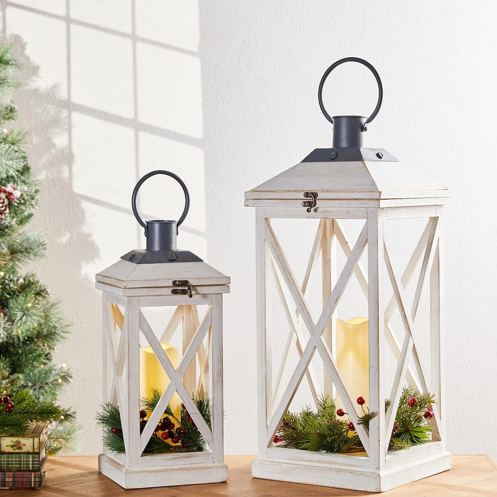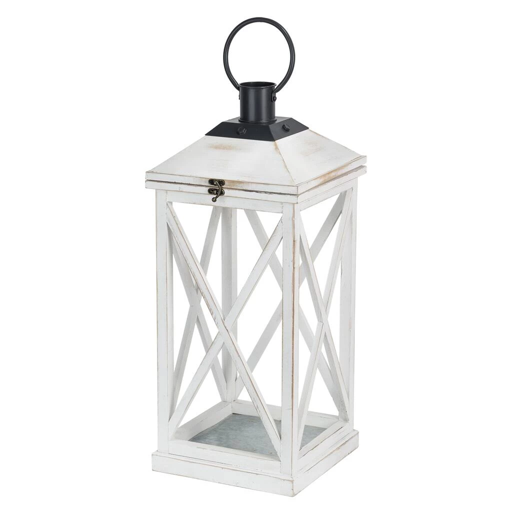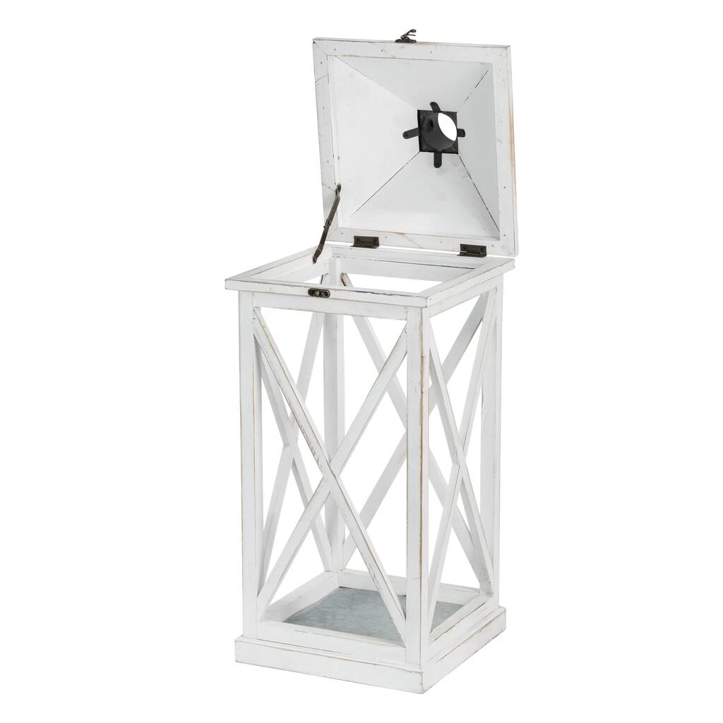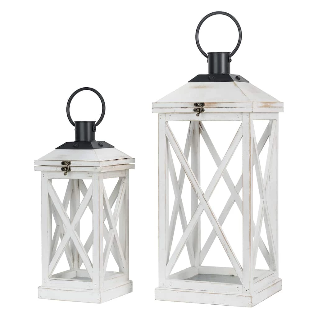 Featuring simple, white windows without glass and distressed finishing, these lanterns easily create a warm, inviting glow anywhere in your home, porch or yard. This set of 2 lanterns are crafted of natural fir wood, each featuring a frame with black metal top, swing latch and premium hinges connected. With flame-retardant galvanized metal floors inside, they will provide safety when lighting candles. The lanterns fit multiple styles of pillar candles, tea-light candles or LED candles. Candles not included.