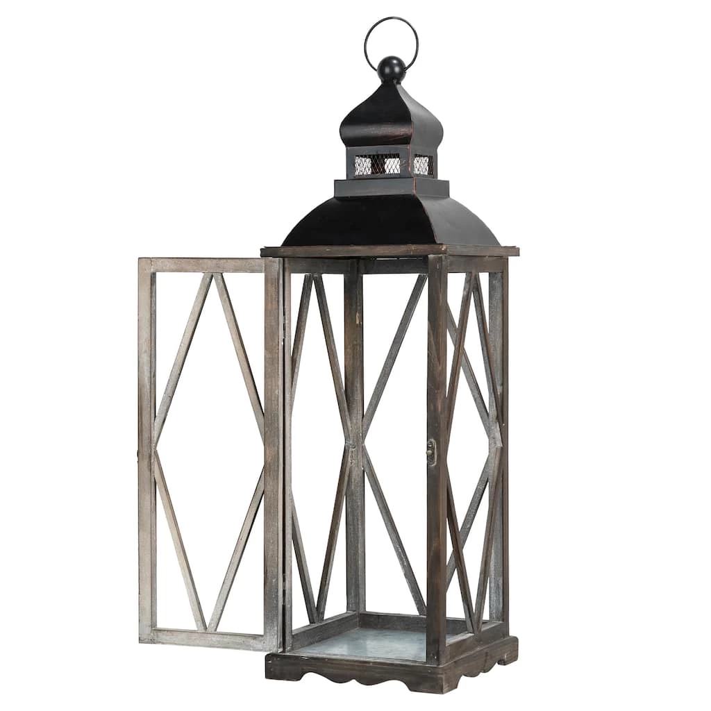 Featuring hollow black diamond windows and farmhouse style, these lanterns easily create a warm, inviting glow anywhere in your home, porch or yard. This set of 2 lanterns are crafted of natural fir wood, each featuring a frame with black metal top, swing latch and premium hinges connected. With flame-retardant galvanized metal floors inside, they will provide safety when lighting candles. The lanterns fit multiple styles of pillar candles, tea-light candles or LED candles. Candles not included.
